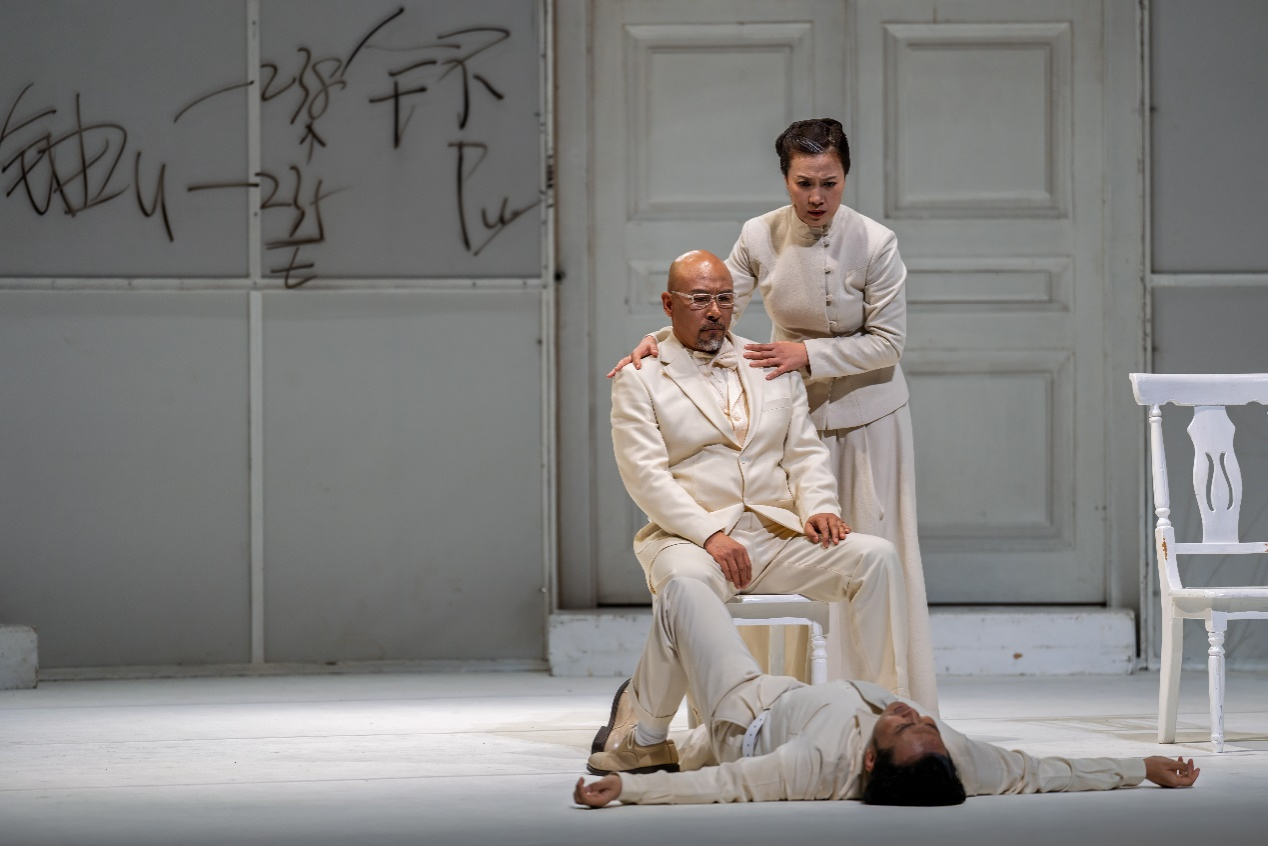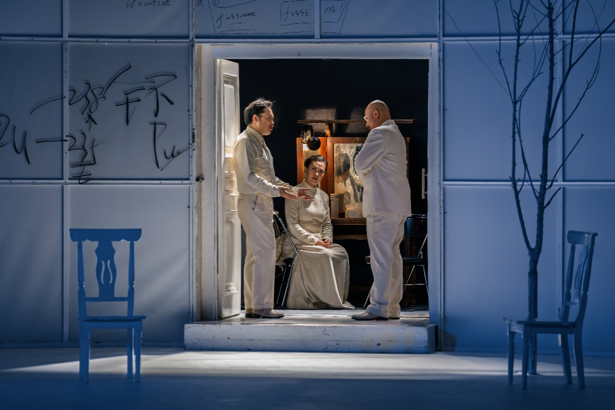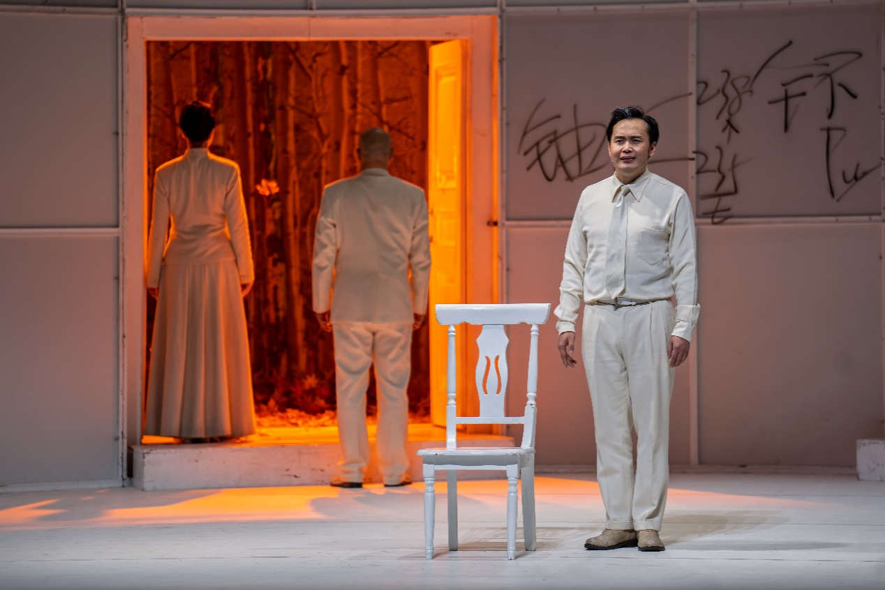 话剧围绕德国物理学家海森堡和丹麦物理学家波尔及其夫人玛格丽特在1941年的哥本哈根会晤展开,探讨了科学与伦理、历史与责任的深刻主题。三把椅子、二扇门、一枝树枯,构成了一个充满神秘色彩的对话空间。三名演员身着纯白服装,以对话为桥梁,开始了一次又一次的回忆、叙事和呈现,展现了二战背景下科学家们在道德抉择与心灵挣扎中的深刻冲突。《哥本哈根》就是用艺术的方式,将无法用常规叙事讲述的内容,容纳并置于舞台的空间,以此来重回历史现场,不断演示、假设、展现历史迷思的可能解释。