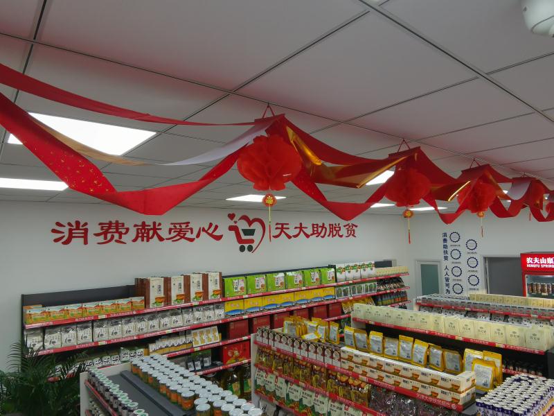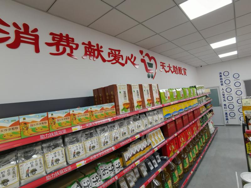 该超市作为展示天津大学扶贫工作和介绍宕昌情况的窗口,墙面上有天津大学扶贫工作的发展历程、宕昌县和特色农产品的简介,还有“消费献爱心、天大助脱贫”等暖心宣传语。在这里消费者不仅能够买到健康、绿色又美味的特色农副产品,还可以让“消费就是扶贫”的理念不断扎根于消费者心里。
