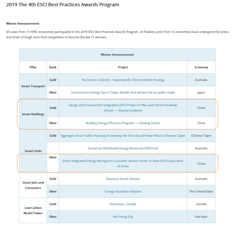据悉,APEC能源智慧社区(ESCI)最佳实践奖是APEC内唯一的项目奖,奖励APEC区域内优秀的智慧交通、智慧建筑、智能电网、智慧工作及低碳示范城镇共五类案例。自2013年起,该奖项每两年征集、评审、颁奖一次,针对上述五个类别分别颁发金、银奖各一个,此前中国无案例获奖。