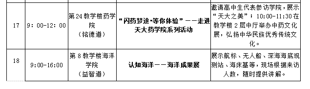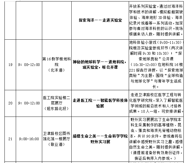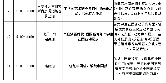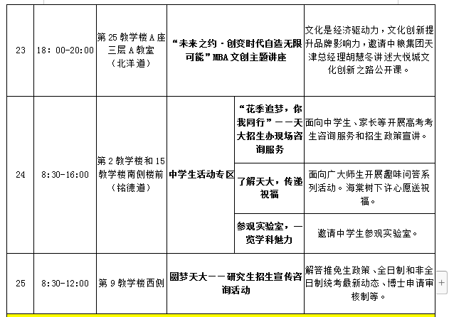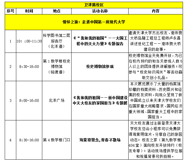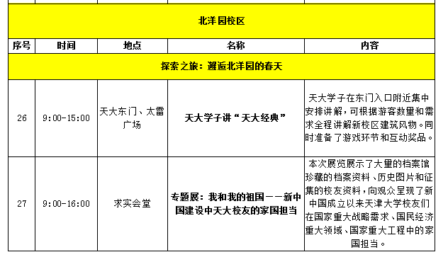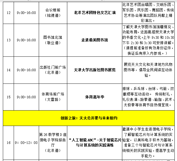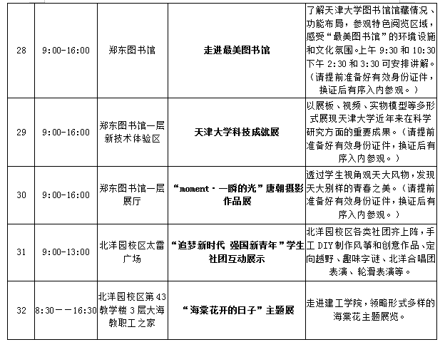 开放日当天,在天津大学卫津路校区和北洋园校区内将举办招生宣传咨询、校史博物馆开放、校友接待服务等各类主题活动32项(具体安排详见附件)。