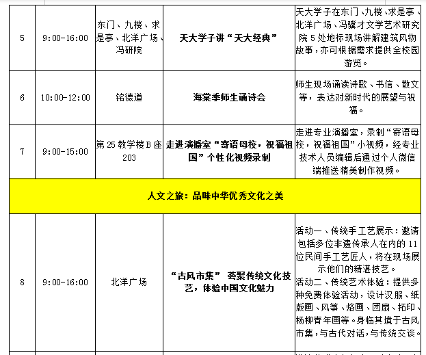 届时将举办“我和我的祖国”《“大国工程”中的天大力量》专题报告,“‘未来之约’天大公开课”系列文化体验活动,“海棠季·古风市集”非遗技艺互动体验,部分学院、研究院、实验室开放与展示活动,校史博物馆参观,天津大学科技成就展,师生书画作品展及户外书画互动等。