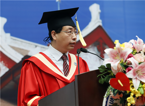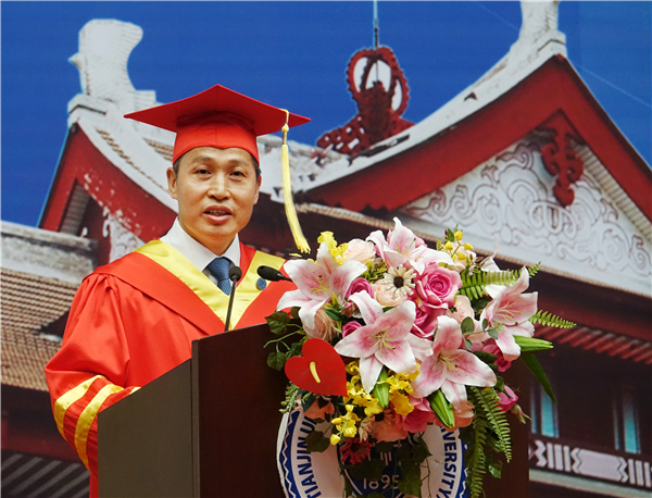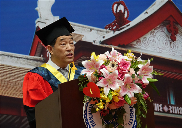 参加研究生毕业典礼的校友代表林铁坚是广西玉柴工程研究院院长,被玉柴人誉为“男神”。从1994年入学到2005年博士后出站,林铁坚在天津大学整整11年,烙下了深深的天大印记。他与同学们分享了自己的学习与工作经历,寄语学弟学妹,涵养“五颗真心”。永保创新探索之心,不要在时间推移中丢掉创新的精神;心无旁骛,保持专注之心,踏踏实实积累和奋斗;保持不断学习之心,紧跟时代步伐;保持协同合作之心,学会与他人合作、沟通,做一个开放包容,有良好合作沟通能力的人;不忘初心,严守学术道德,实事求是。他对同学们说:“今天以后,你们的人生事业即将扬帆起航,会是诗情画意的坦途,也会面临挫折与逆境,无论面对何种境遇,请涵养这五颗心,你们的所有付出,都将得到回报。”