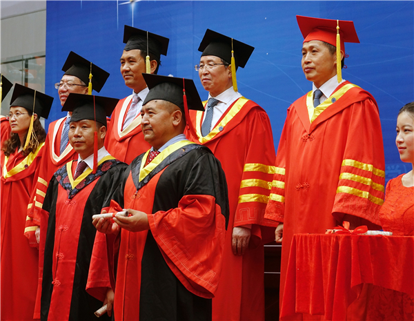 校领导、各学院领导和学位委员会委员代表依次为博士毕业生拨动流苏