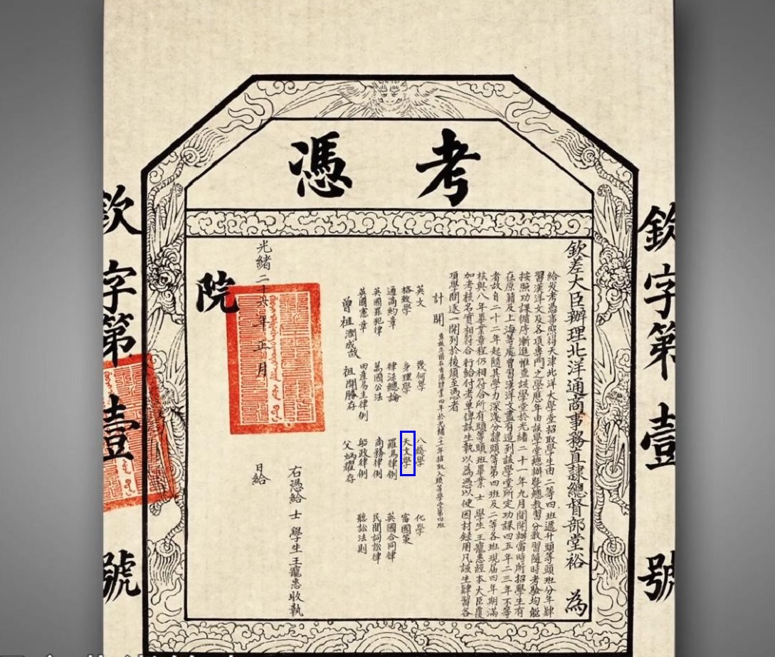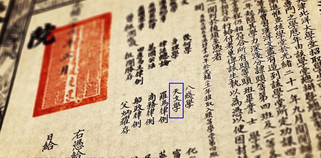 早在1895年,天津大学的前身北洋大学建校之初,就以“星空”之美融入对学生的通识教育之中。据史料记载,天津大学(北洋大学)是中国最早开设天文课程的现代大学,在中国第一张大学文凭(“钦字第一号考评”)上,详细记录了中国法学第一人,毕业生王宠惠本科学习的基础课程:英文、几何、化学、格致学(物理)、地理、天文学、富国策......“天文学”赫然列于其中。
