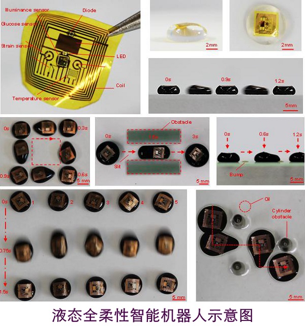 天津大学黄显教授团队受自然界柔软的水母、轮虫等腔肠动物和浮游生物的启发,利用液滴的柔软无定形特性和柔性电子器件的超薄柔软特性,构建了一种全新的“智能液滴”——液态全柔性智能机器人。这是一种超小型、全柔性、可编程控制的液态智能机器人,能够在不同环境条件下实现运动、变形和传感测量。这种机器人除了具备良好的运动和环境适应能力之外,还搭载了多种传感器,如温度传感器、湿度传感器、光学传感器、应力传感器、葡萄糖传感器、食品毒素传感器和无线能量采集模块等,未来可应用于基因测序、化学合成、药物递送等领域,有望成为能进入人体检测治疗的“血管医生”,具有十分重要的科学意义和应用价值。