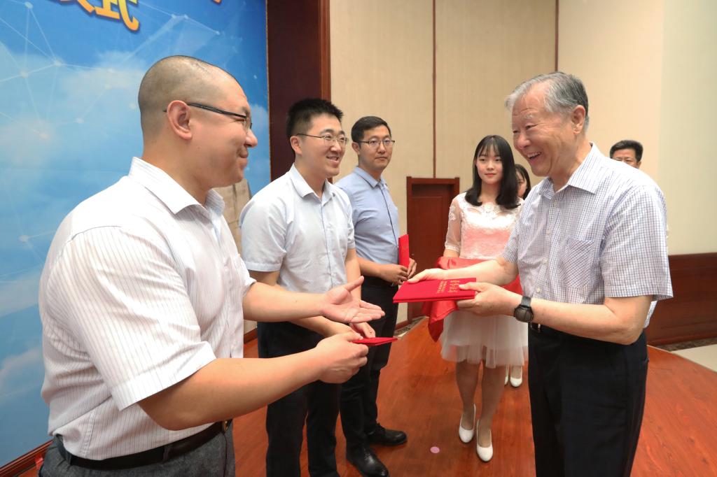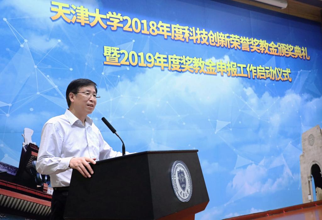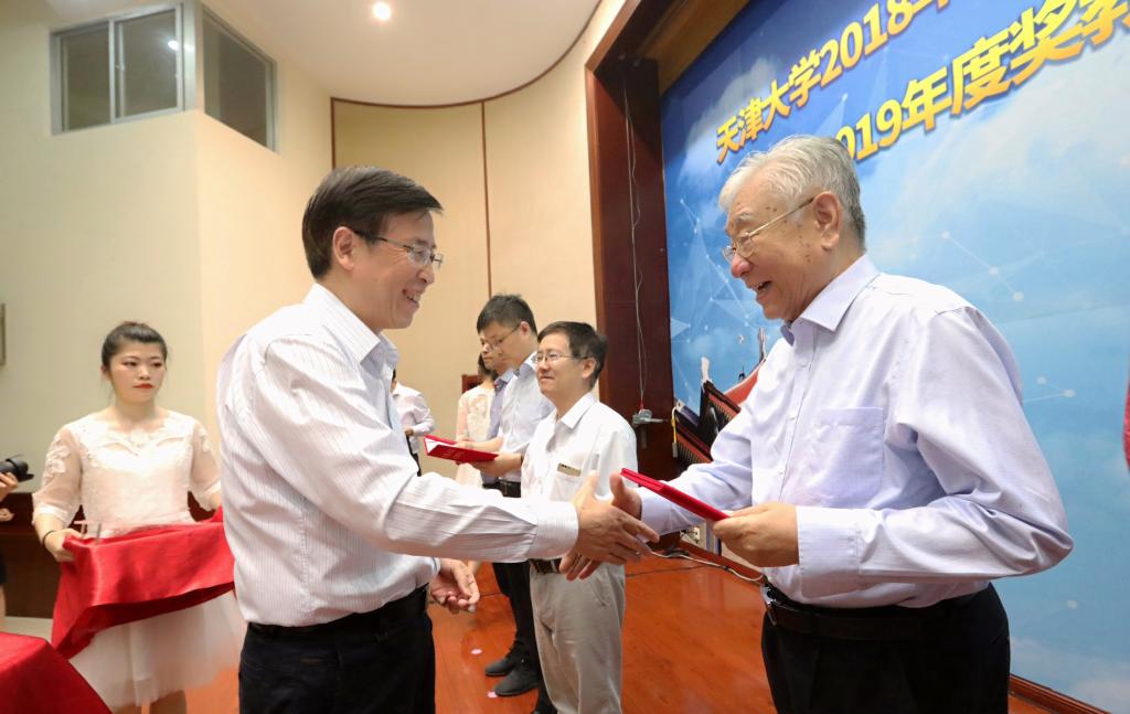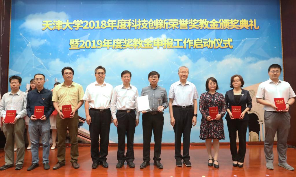 本站讯(摄影 唐蒙)6月6日下午,天津大学2018年度科技创新荣誉奖教金颁奖典礼暨2019年度奖教金申报工作启动仪式在卫津路校区科学图书馆二层报告厅举行。天津大学党委书记李家俊,中国工程院院士、奖教金专家委员会主任余贻鑫院士,天津大学副校长元英进,副校长王树新出席典礼。由苏万华院士牵头的“柴油机高效清洁燃烧创新团队”、练继建教授牵头的“水利水电与海上风电工程创新团队”、杜伯学教授牵头的“特高压电气设备绝缘关键技术创新团队”获评2018年度天津大学科技创新荣誉奖教金,获奖团队成员和校友与基金事务处、党办校办、学工部、教务处、科研院、人事处、研究生院、校团委、区域院的相关领导,以及来自校内多个学院的领导、师生代表共计200余人参加了典礼。李家俊、余贻鑫共同为获奖团队颁奖,元英进宣读获奖团队的表彰决定,王树新主持典礼。