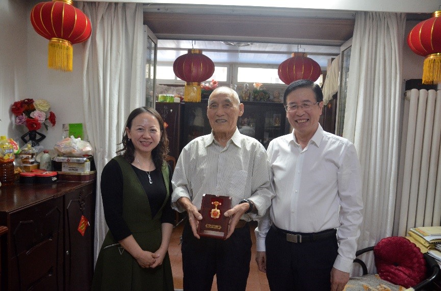 本站讯(通讯员 张海超)9月25日,在庆祝中华人民共和国成立70周年之际,天津大学党委书记李家俊带队来到离休干部、抗战老兵刘振昌家中慰问,与老同志亲切交谈,并为其带去了庆祝中华人民共和国成立70周年纪念章和慰问金。老干部党总支书记汪菲,副书记李春意陪同走访慰问。
