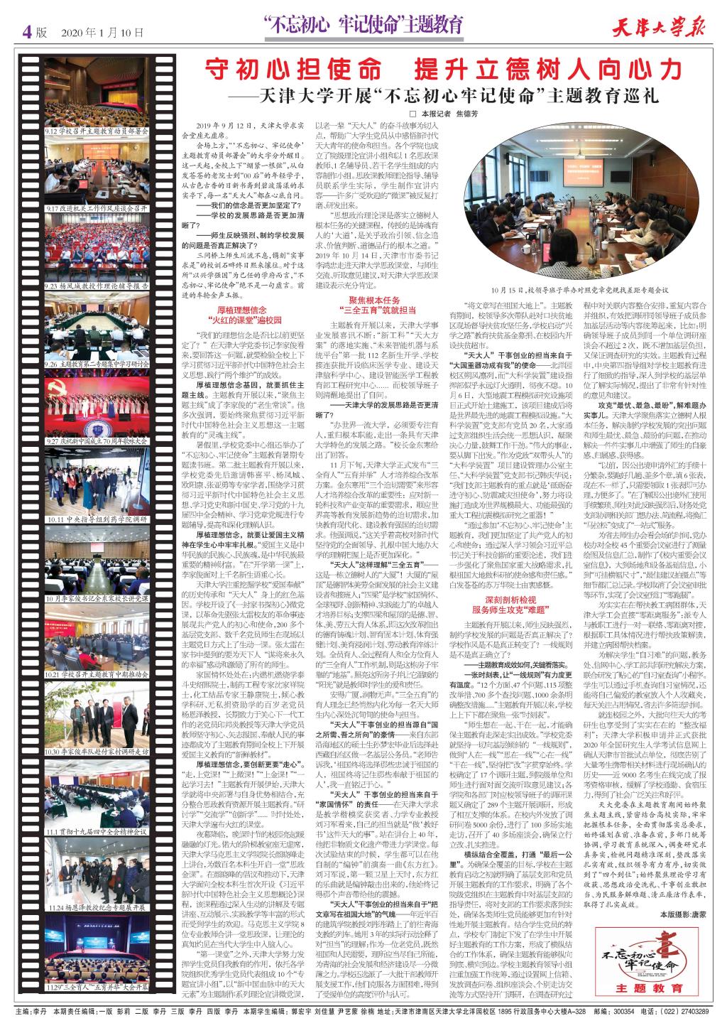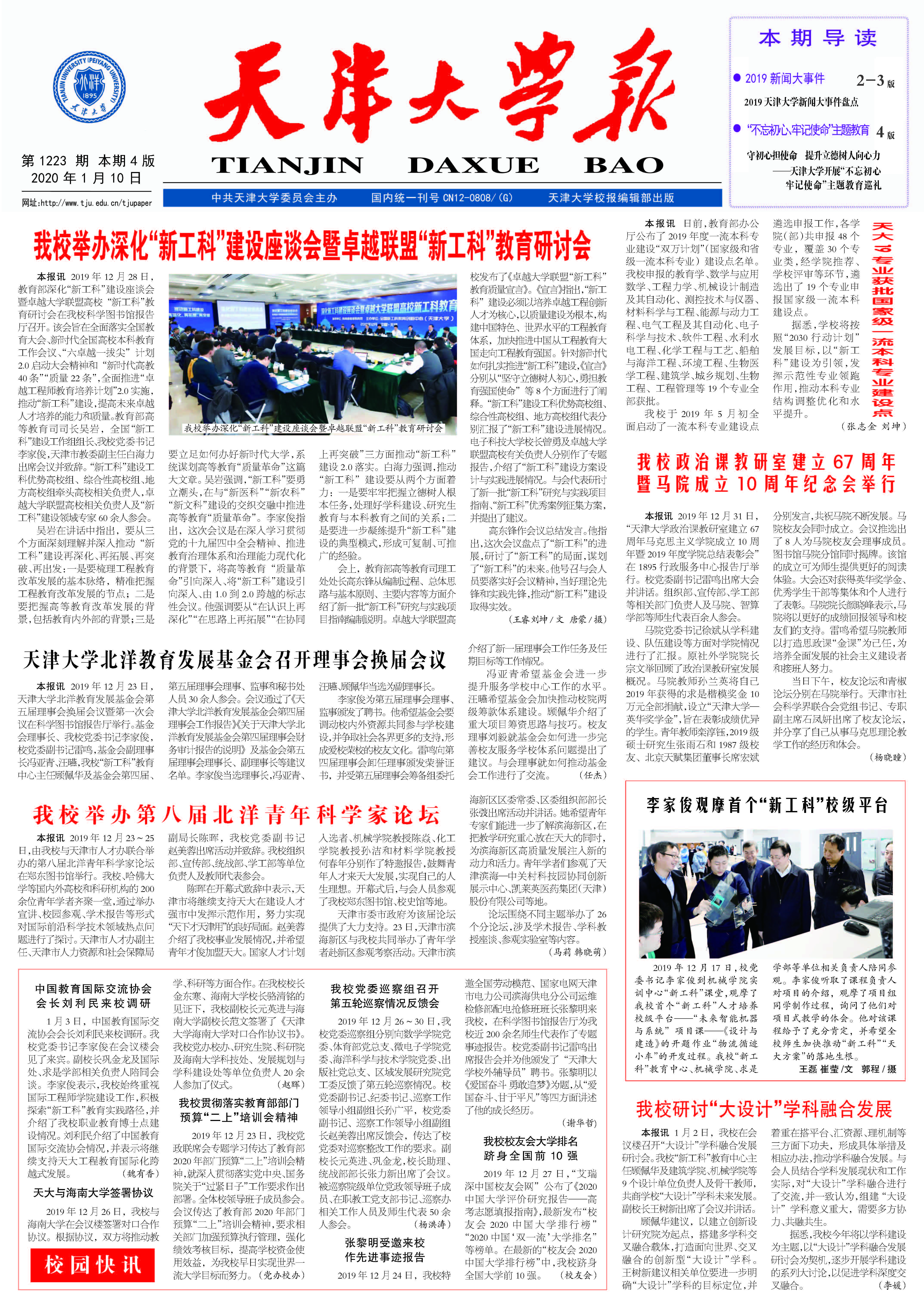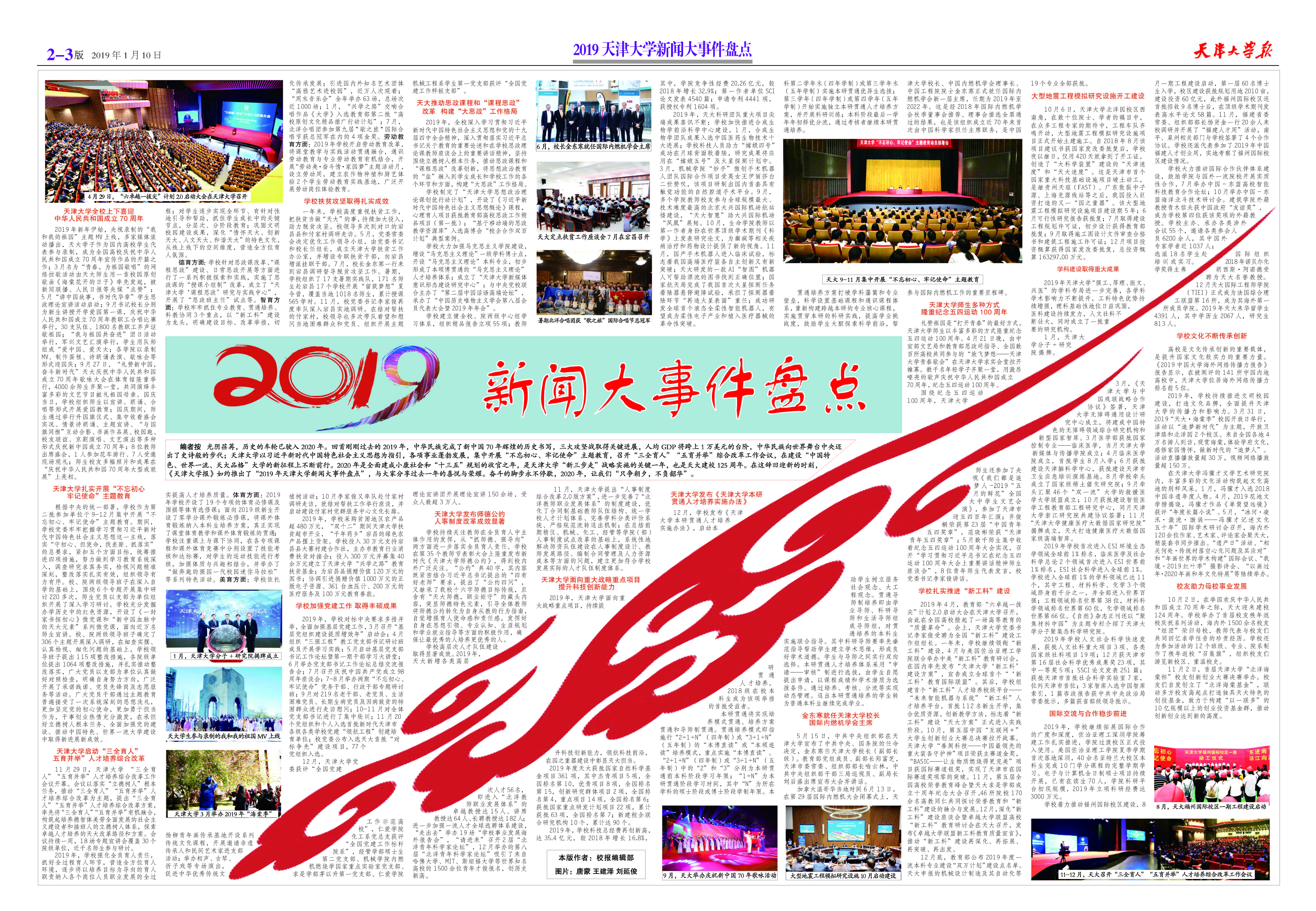 光阴荏苒,历史的车轮已驶入2020年。回首刚刚过去的2019年,中华民族完成了新中国70年辉煌的历史书写,三大攻坚战取得关键进展,人均GDP将跨上1万美元的台阶,中华民族向世界舞台中央迈出了史诗般的步代;天津大学以习近平新时代中国特色社会主义思想为指引,各项事业蓬勃发展,集中开展“不忘初心、牢记使命”主题教育,召开“三全育人”“五育并举”综合改革工作会议,在建设“中国特色、世界一流、天大品格”大学的新征程上不断前行。2020年是全面建成小康社会和“十三五”规划的收官之年,是天津大学“新三步走”战略实施的关键一年,也是天大建校125周年。在这辞旧迎新的时刻,《天津大学报》如约推出了“2019年天津大学新闻大事件盘点”,与大家分享过去一年的喜悦与荣耀。奋斗的脚步永不停歇,2020年,让我们“只争朝夕,不负韶华”。