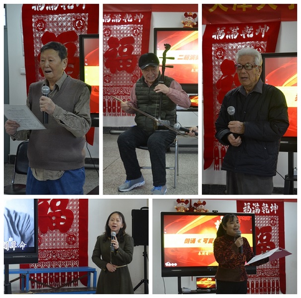 离休干部们发挥自身所长,表演了精彩的节目。三村党支部书记杨庆文现场演绎《国际纵队进行曲》《海港之夜》等歌曲;六村南党支部书记郝瑞峰带来二胡演奏《绣金匾》;北五村党支部党员王珍玺演唱歌曲《喀秋莎大炮》和《我的家乡》,并代表老干部们向为老同志服务的所有工作人员表示感谢。此外,特邀嘉宾汪菲、北洋艺术团的学生代表等也表演了精彩的节目。