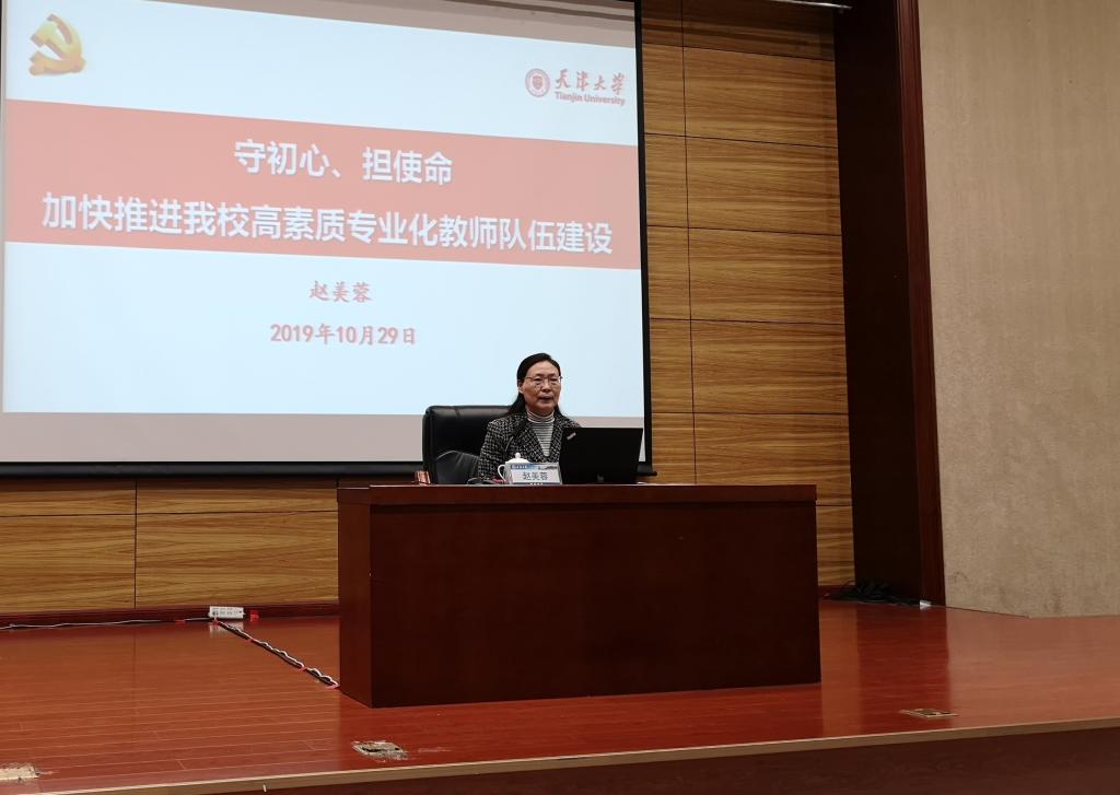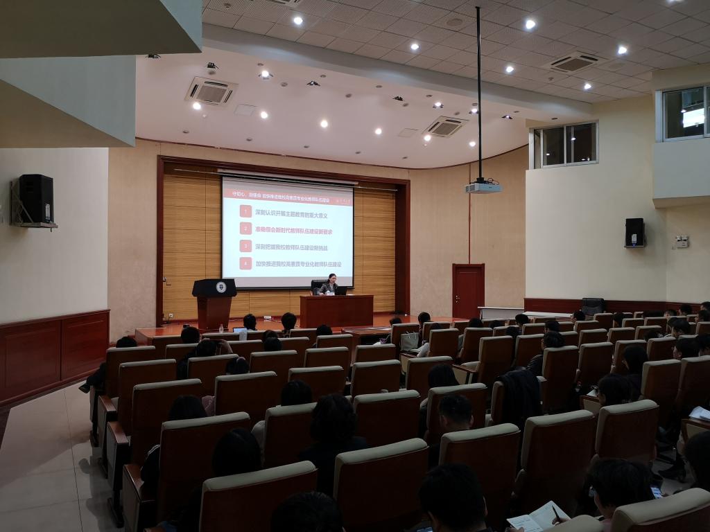 本站讯 (通讯员 刘超)10月29日下午,根据学校主题教育工作安排,校党委副书记赵美蓉以“守初心、担使命,加快推进我校高素质专业化教师队伍建设”为题讲授专题党课。组织部、统战部、教工部、人事处、工会、离退休处全体同志,以及各院级单位主管人事工作副院长、人事干部百余人参加了此次专题党课。