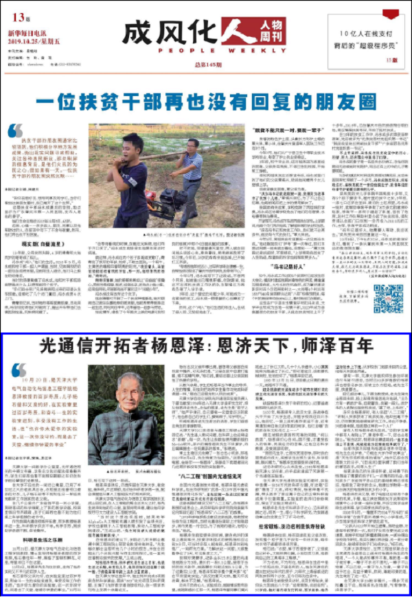 天津大学自动化学院光纤通信实验室负责人于晋龙教授1994年进入天津大学读研究生时,师从杨恩泽老先生。在他的眼里,老先生是“君子之师”,“他严于律己,自己要做一名堂堂正正的君子,他也教自己的学生们,要做君子,知学明礼。”