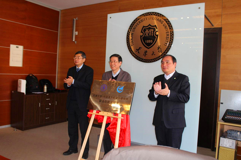 李家俊、赵伟华、邓景辉代表双方为天津大学-中国直升机设计研究所联合创新实验室揭牌。