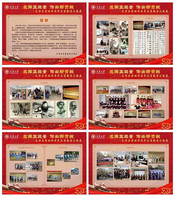 本站讯(通讯员王小轩)岁岁重阳,今又重阳。作为敬老月系列活动的一部分,“发挥正能量,做出新贡献——天津大学北洋老年大学教学汇报展”于10月7日起在天津大学卫津路校区九楼西侧橱窗及天津大学北洋园校区1895行政楼西侧橱窗进行展出。