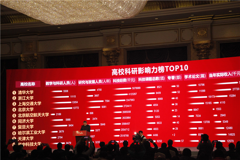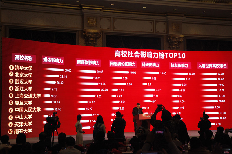 人民网总编辑余清楚在论坛上发布中国高校社会影响力2017年度排行榜。清华大学、北京大学、武汉大学、浙江大学、上海交通大学、复旦大学、中国人民大学、中山大学、天津大学、南开大学入选榜单前十位。此外天津大学还跻身全国高校科研实力前十。据人民网总编辑余清楚介绍,该排行榜结合了教育部权威数据,通过大数据挖掘,围绕高校媒体影响力、网络舆论影响力、科研影响力、校友影响力等多个维度,对高校的社会影响力进行评估。