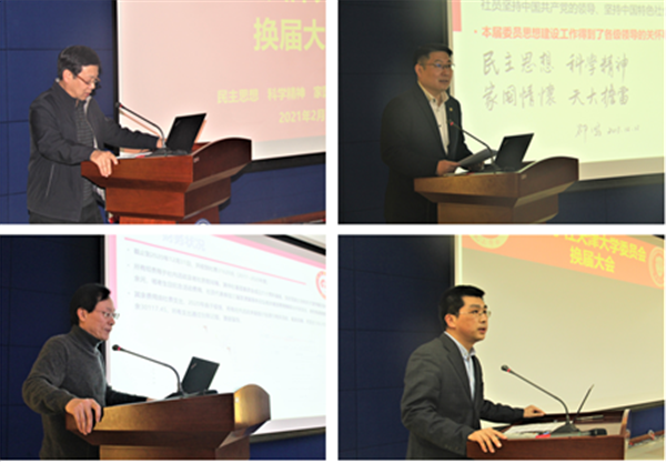 王明时、张凤宝、张力新、孙华林、孟昭宽分别代表九三学社天津大学基层委员会老同志、老主委、天津大学党委统战部、九三学社天津市南开区委会、九三学社天津市委会向新当选的委员们表示祝贺,高度评价了九三学社天津大学第六届基层委员会的工作及所取得的成绩,同时对新一届领导班子提出殷切希望,希望新一届九三学社天津大学基层委员会深入理论学习,增强“四个意识”、坚定“四个自信”、做到“两个维护”,牢记使命;继承、弘扬九三学社光荣传统,进一步加强社基层组织建设和活动,积极参政议政、建言献策,为推动九三学社和天津大学的发展做出更大的贡献!