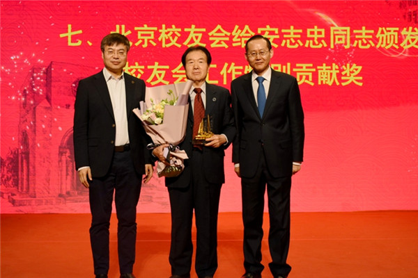 袁华之宣读《北洋大学天津大学北京校友会关于给安志忠同志颁发校友会工作卓越贡献奖的决定》,金东寒和袁华之为安志忠同志颁发奖杯并送上鲜花。决定中提到,安志忠同志自2013年担任北京校友会第九届校友会常务副会长以来,不忘初心、心系母校、创新思路、践行使命、无私奉献、不辞辛苦,始终怀抱强烈的使命感和责任感,把校友会工作当作事业,为北京校友会的发展做出了重要贡献。希望广大在京校友以安会长为榜样,积极参与支持校友会工作,一心一德共扬校誉于无穷。