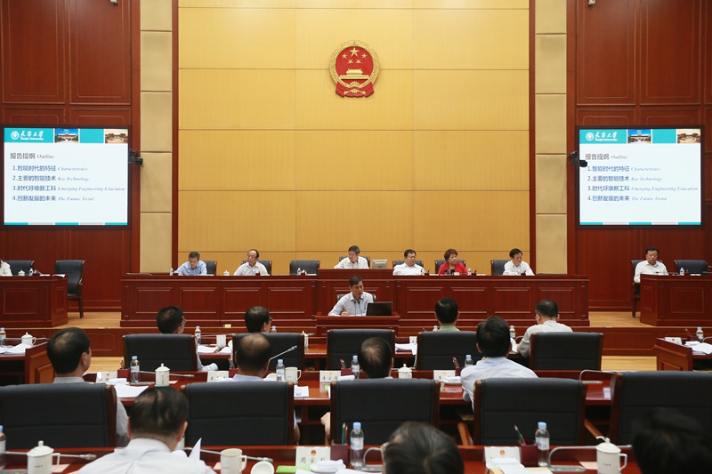 钟登华指出,科技创新正在改变生活,正在改写历史,已经并将进一步改变人类的历史进步和未来发展。他从世界上第一台通用计算机、图灵测试、达特茅斯人工智能夏季研究会,到统计学方法、大数据、云计算以及Alpha GO击败中国棋手柯洁等,简要回顾了人工智能的发展历程。未来人工智能将会进一步引发产业结构变革,成为新一轮工业革命的推进器。在主要的智能技术方面,他结合天津大学近年来开展的科研工作,介绍了无人驾驶汽车、无人机、工业机器人、特种机器人、脑机接口、人机混合智能等技术及其应用。随后,钟登华从传统制造到智能制造的变革,提出智能时代需要培养更多的新工科人才,并简要介绍了新工科的内涵、新工科的特征、新工科的探索与实践、新工科建设路线图(天大行动)等内容。最后,钟登华从实施创新驱动发展战略、综合性国家科学中心、国家重大科技基础设施、加快建设创新发展的现代化天津等方面,提出天津大学将发挥人才、学科、科研等优势,服务“五个现代化天津”的建设。