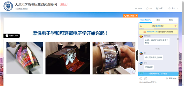 在短短1小时的直播期间,胡文平老师结合个人科研经历与考生家长重点分享了半导体领域的科技创新之路,并以有机光导、有机发光、有机电路为例,介绍了有机电子学这门新兴的前沿交叉科学,同时全方位解读了天津大学的历史沿革、办学特色、培养模式、科研成果、学生发展等情况。“坚守兴学强国使命,投身科研攻关,突破卡脖子技术”的理念贯穿着胡文平老师的整场报告。