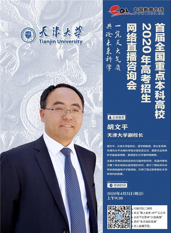4月5日,在中国教育在线直播平台,天津大学副校长胡文平教授为数千名高三考生及家长带来了一场主题为“一览天大气质、共论未来科学”的线上科普报告,让考生及家长即使在特殊时期依然可以近距离认识天大、了解天大。