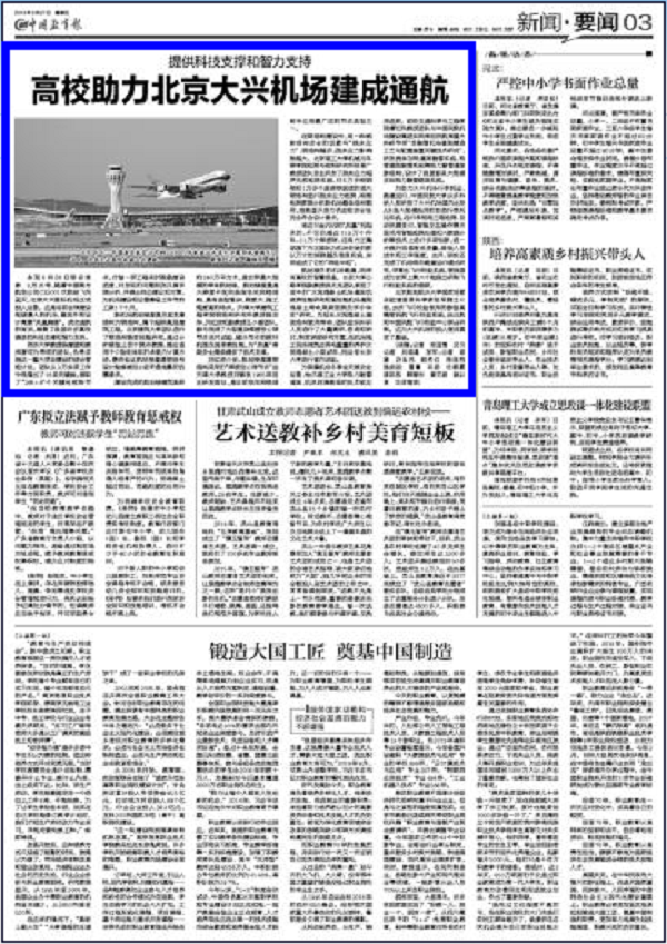 本报9月26日综合消息 9月25号,随着中国南方航空公司CZ3001次航班飞向蓝天,北京大兴国际机场正式投入运营。这是目前全球建设规模最大的机场,整体外观设计寓意“凤凰展翅”。成功通航的背后,凝聚了我国许多高校提供的科技支撑和智力支持。
