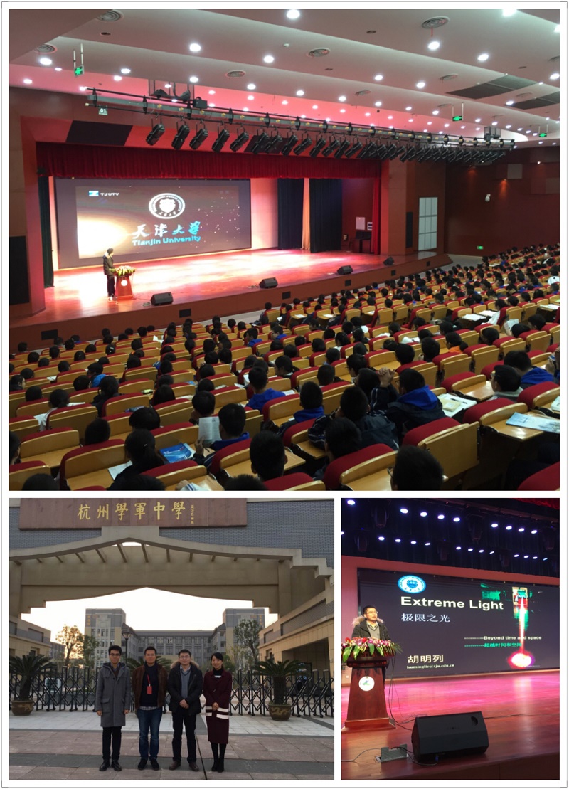 12月6日至7日,在杭州市学军中学和桐乡高级中学,天津大学名师宣讲团成员、精仪学院教授胡明列作了题为《极限之光》的科普报告。胡明列首先从光的“发展历程”、“光学实验室”、“电和光的重要意义”三个方面向在校学生展示了极限激光的奥妙和精彩。随后,他介绍了天津大学的办学历史、学科特色和人才培养等情况,并叮嘱学生们在努力学习文化知识的同时探索自己兴趣所在,为日后报考专业提供参考。