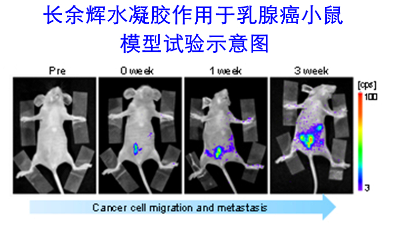 乳腺癌小鼠模型实验结果显示:这种新型水凝胶生物相容性好,无毒无副作用,不影响肿瘤的转移和侵袭,并具有很高的灵敏度,能够克服干扰在小鼠的肿瘤部位持续释放发光标记探针,标记肿瘤细胞,实现肿瘤转移的无创、高选择性、无背景干扰成像示踪。