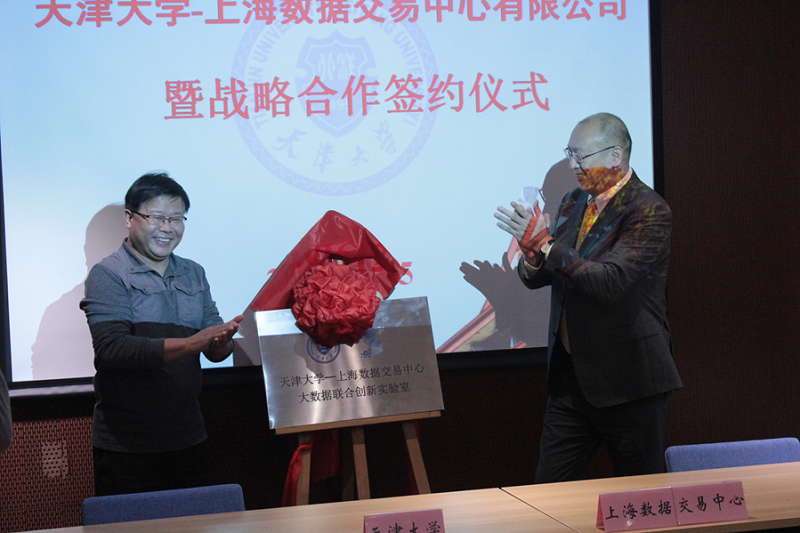 元英进与汤奇峰分别代表双方签署战略合作框架协议,并为天津大学——上海数据交易中心大数据联合创新实验室揭牌。