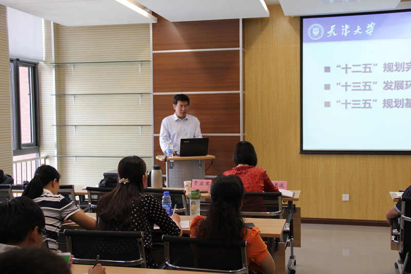 贾启君首先简要回顾了我校“十二五”期间的发展成就,接着分析了“十三五”期间的发展环境,最后重点就“十三五”期间的发展规划进行了解读。按照学校“十三五”规划,我校将实施新的三步走战略:2020年,建成世界知名高水平大学;2030年,建成世界一流大学;2045年,全面建成世界一流大学。对这一发展战略,与会老师和同学备受鼓舞,也深感肩上的压力很大,纷纷表示要更加努力的工作和学习,为早日把天津大学建成世界一流大学做出自己应有的贡献。随后,党委书记刘洪波上了一堂主题为“绿色发展 走向生态文明新时代”的党课。党的十八大以来,以习近平同志为核心的党中央,从中国特色社会主义事业“五位一体”总体布局的战略高度,从实现中华民族伟大复兴中国梦的历史维度,强力推进生态文明建设,引领中华民族永续发展。刘洪波从“党中央国务院关于生态文明建设和环境保护的新理念新思想新战略;十八大以来关于生态文明建设治国理政的新实践;‘十三五’期间关于生态文明建设和绿色发展的总体部署”三个方面详细阐述了涵盖重大理念、方针原则、目标任务、重点举措、制度保障等诸多领域和方面的我国生态文明建设和环境保护工作的一系列重大决策部署,并对习近平总书记关于生态工作的新理念新思想新战略进行了系统梳理。