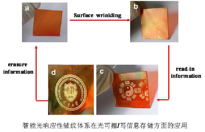 基于表面皱纹的松弛特性,鲁从华教授指导的博士研究生宗传永同学以构筑智能皱纹体系为出发点,在膜/基体系中引入光响应性偶氮材料,利用聚合物中偶氮苯基团的光致可逆顺反异构化反应引发膜/基体系中储存应力的释放和调整,实现了膜/基体系表面皱纹形貌的大面积擦除和智能调控;借助选区曝光,进一步实现了多种高级皱纹图案的可控制备;结合理论模拟深入揭示了光擦除皱纹的内在物理机制;开拓了皱纹体系在光可擦写信息存储等方面的全新应用。该研究不仅发展了一种简单全新的光调控法,实现了材料表面消皱,而且为破解表面防皱的难题提供了新思路。