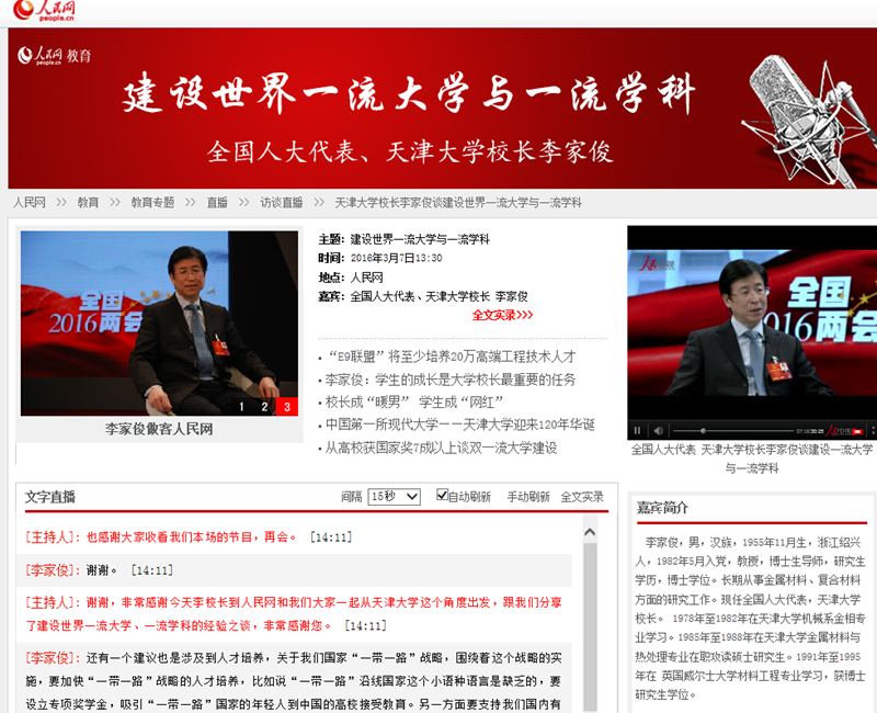 与此同时,天津大学官网(中英文),天津大学新闻网的两会专题,也对天津大学两会代表委员的参会情况进行了全方位立体报道。其中,天津大学官网(中文)推送1条大图新闻,19个小图报道链接;天津大学官网(英文)也积极配合两会的宣传,发布了1篇大图两会新闻,总计3篇小图两会新闻;天津大学新闻网开设了【两会·天大声音】专题,并在首页对两会新闻重点报道,先后编辑发布39篇稿件。