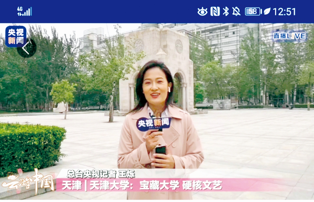 5月4日上午,央视新闻“云游中国”——五四特别直播走进美丽的天大校园。在该节目中,央视记者打卡了全国各个“最美大学校园”:看中国第一所现代大学——天津大学、赏北京大学未名湖、游拥有百年历史的复旦大学、品传统园林式雅致风格的南京师范大学、漫步号称“海景校园”的厦门大学、逛坐落在天府之国的四川大学。在节目中,天津大学卫津路校区的美丽风光隆重出镜。应网友期盼,央视记者走进了天津大学冯骥才文学艺术研究院实地探访,感受了人文厚重的文化艺术氛围。