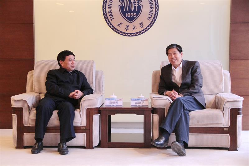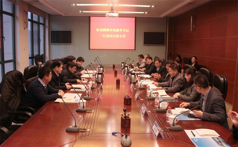 本站讯(通讯员 孙亮)12月9日下午,河南省鹤壁市市委书记范修芳一行5人访问天津大学,洽谈市校合作相关事宜。校党委书记、校友总会会长刘建平在卫津路校区会议楼贵宾室亲切会见来宾,副校长、科研院院长、校友总会副会长元英进与来宾在第一会议室举行了工作会谈。鹤壁市委常委、市委秘书长李成宽,科技局局长秦志军,规划局副局长李松涛,国立光电董事长朱明甫陪同来访;设计总院院长洪再生、党委书记余敬海,校友总会常务副秘书长、校友与基金事务处处长李秀民,海洋学院党总支书记、常务副院长牛志广,科研院副院长杨明海,设计总院副院长张锡治、袁大昌,经管学部党委副书记施亮星等陪同会见及会谈。