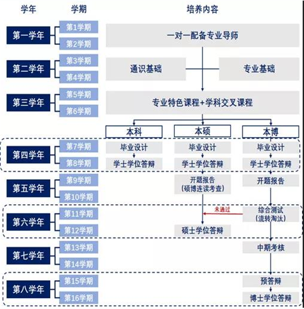 生物科学专业强基计划学生进行单独编班,实施全员导师制、小班化、个性化培养。启用全新的人才培养方案,采用本博贯通培养(3+5),实行多阶段性考核和动态进出,优化培养环节,缩短本科-博士培养年限。发挥学校新工科建设领军高校优势,加强生物科学与工科、理科、医科、人工智能的深度融合,为学生个性化发展提供多种路径与选择。