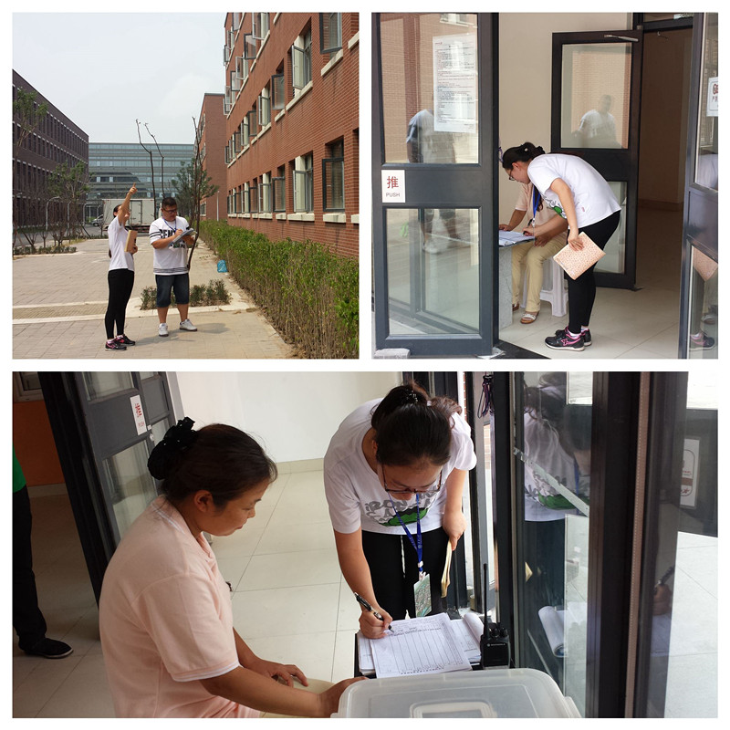 27日当天气温高达35℃,且气压低,湿度大,检查小组逐一巡视每栋公寓楼的开窗情况,查看物业人员巡查记录,在了解学生公寓现状后,再进行签字确认。面对高温酷暑下的室外作业,后勤保障部职工没有丝毫怨言,忠于职守,默默奉献。物业管理办公室王忠明老师表示,新校区物业管理办公室运行部的工作精神是经得起考验和发扬的,他希望年轻人经过艰苦的锻炼,能尽快成长起来,为新校区各项工作的顺利进行发挥好各自的价值与能力。