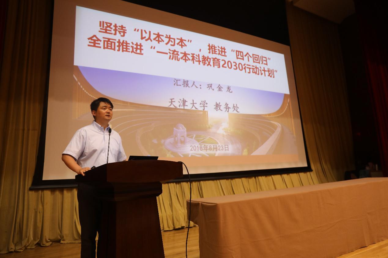 教务处处长巩金龙作了《坚持“以本为本”,推进“四个回归”—— 全面推进“一流本科教育2030行动计划”》的专题报告。他从贯彻落实全国高等学校本科教育工作会议精神讲起,介绍了本科教学审核评估工作及要求、“一流本科教育2030行动计划”实施进展,国际高等教育发展趋势及新工科建设状况、本科教学管理规范常态化要求等内容。