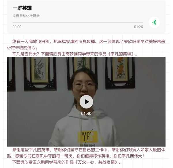 各学院积极创新活动形式,深入推进“学雷锋”线上主题教育。求是学部面学部向全体学生征集“雷锋月”主题文创作品,作品形式包括书画作品、原创诗歌散文、原创公益宣传片、志愿活动心得等。经管学部以疫情中的雷锋精神为主题,向学部全体师生征集文画音像等创意作品。自动化学院举办“学雷锋 战疫情 ”线上诗词朗诵大赛,得到学生广泛参与。材料学院通过院学生会发出倡议,号召全体学子向雷锋同志学习、向为防控疫情奉献的个人学习,到基层报到,为疫情防控做力所能及的工作,开展经常性的志愿服务。