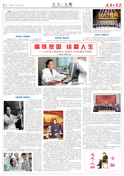 9月1日,在教育部召开的第三次“2017教育金秋系列新闻发布会”上,全国教书育人楷模名单揭晓,中国工程院院士、我校化工学院教授王静康光荣当选“2017年全国教书育人楷模”。作为一名国际知名的化学工程专家和从教57年的高校教师,“国家科学技术进步奖”“国家发明奖”“全国五一劳动奖章”“全国三八红旗手”“国家巾帼发明家”......累累奖项缀满了王静康的科教生涯,但她却对这次获奖格外珍视:“这是党和人民给我的荣誉,对我自己来说更是一份沉甸甸的责任。”多年来,王静康带领团队承担了多项“国家重大科技攻关”及“国家支撑计划”项目;坚持为本科生、研究生授课,编写教材;作为科学道德和学风建设宣讲专家,多次为青少年进行“学术道德”宣讲。王静康用自己的行动履行了一位人民教师敬业奉献的使命与责任。本报“天大人物”专版特刊发王静康科研教学的先进事迹,以营造尊师重教的良好氛围,激励广大教师向王静康学习,争做党和人民满意的“四有”好教师。