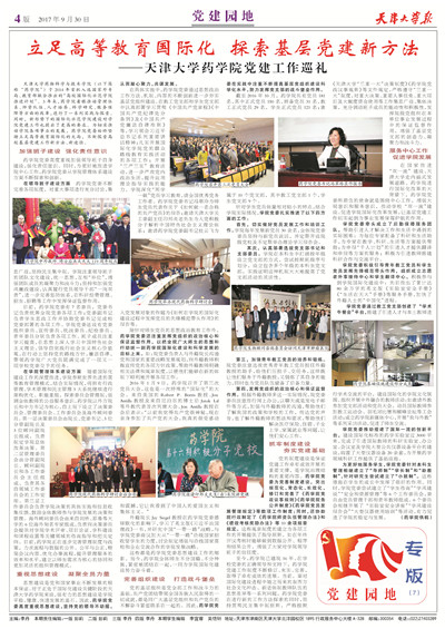 天津大学药物科学与技术学院(以下简称“药学院”)于2014年首批入选国家外专局、教育部联合推出的“高校国际化示范学院推进计划”。3年来,药学院着眼推动管理体系、师资队伍、人才培养、科学研究、服务保障等方面的改革,进行了一系列实践与探索。同时,新形势下的国际化示范学院建设对学院党建工作也提出了更高的要求。为切实推动学院各项事业的发展,药学院党委始终坚持立足高等教育国际化的大局,不断探索高校基层党建工作新方法、新途径。本报特推出“党建园地”专版,以飨读者。