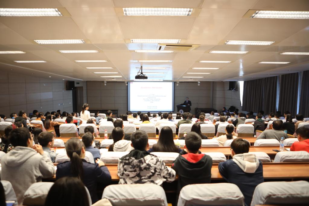 本站讯(通讯员 李洪芳 摄影 陈晓金)10月13日,中国工程院外籍院士、美国工程院院士、澳大利亚工程院院士、墨西哥科学院外籍院士、台湾中央研究院院士、美国俄亥俄州立大学范良士(Liang-Shih Fan)教授莅临我校,在卫津路校区26教学楼报告厅做了精彩的“求是名师讲堂”,题为“范良士院士的学术人生:学生培养、科学方法、化学链技术放大”。我校教务处处长巩金龙以及化工学院师生到场聆听了报告。