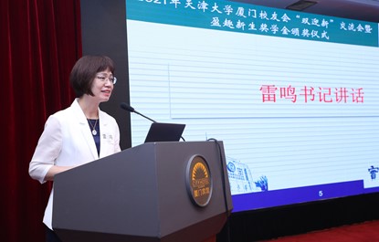雷鸣在讲话中欢迎优秀的福建学子选择了中国第一所现代大学——天津大学,期待新生们能够带着信心和勇气在实现“小我”的过程中,能够慢慢追求“中我”,最终实现“大我”,用实际行动阐释对“家国情怀”及“国之大者”的理解,鹭岛起航、圆梦北洋。她希望优秀的天大毕业生能够在工作道路上继续践行母校“实事求是”的校训,脚踏实地、不负韶华、永远奋斗。她感谢厦门校友会对母校各方面工作的支持,希望厦门校友会能够继续秉持天大文化,涌现发展活力、砥砺家国情怀。