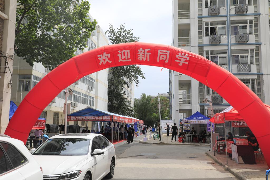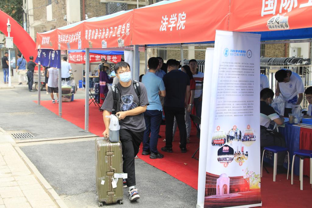 本站讯(记者 张华 刘文琦 武幸童 张馨月 摄影 陈晓金 丁宇) 秋风送爽云天阔,丹桂飘香棠果红。又是一年迎新时,31日上午天空中飘着稀沥沥的小雨仍掩不住北洋园校区南门鲜艳亮眼的“欢迎2021级新同学”的标语,校园路旁初显金黄的树叶映衬着新天大人们脸上收获满满的喜悦。卫津路校区历史悠久的校园建筑、长长的红毯,更让研究生新生们直观感受到了天津大学悠久的历史底蕴和盎然的时代新机。8月31日、9月1日,天津大学7000余名2021级研究生新生开始报到。 因疫情防控常态化要求,学校安排多名工作人员在校门口逐个排查登记检测体温,确保全校师生身体健康。学校各部门各学院负责迎新工作的师生们也早早就位,提前布置好横幅、展板,用最饱满的热情迎接新同学的到来。