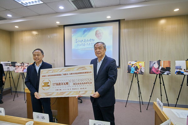 印邦炎教授长子查京民先生代表家属捐资50万元,天津大学校友总会副会长、天津大学关心下一代工作委员会常务副主任、天津大学原党委副书记纪委书记汪曣代表学校接收捐赠。