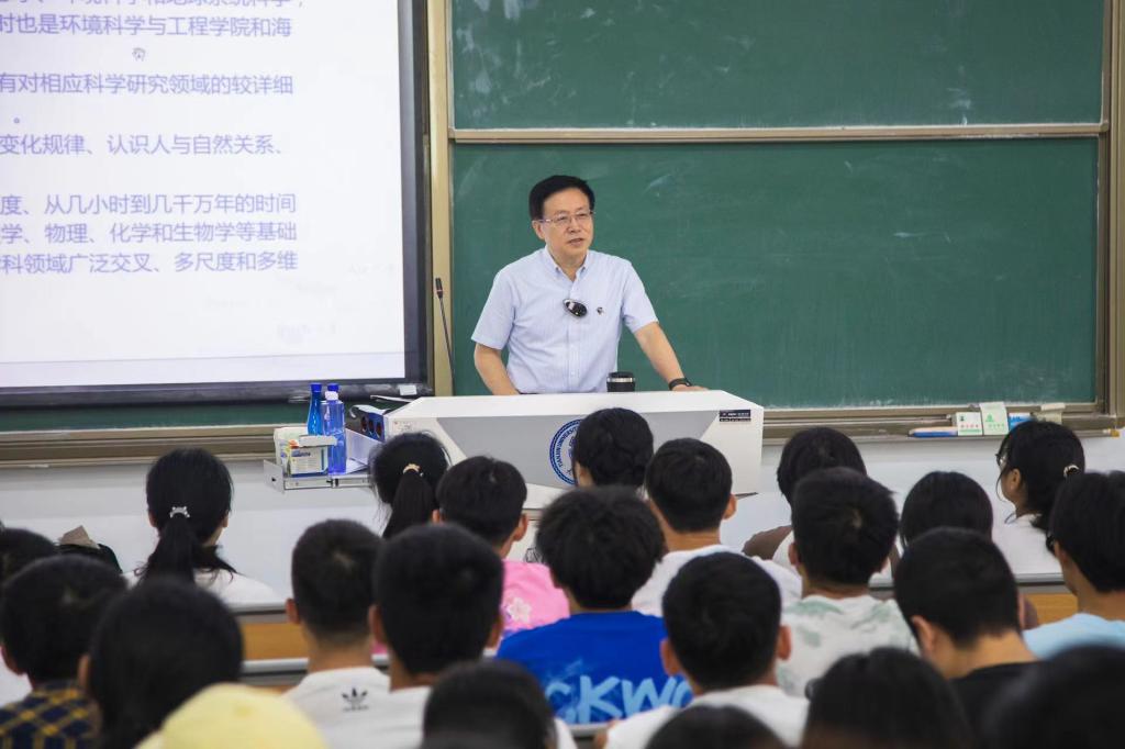 “气候变化——生物多样性丧失——极端天气——粮食危机、水危机——社会问题……从这个链条,同学们可以看到,地球系统科学是一个新兴的交叉学科,研究的是各种现象交织在一起的错综复杂的问题。”刘院士告诉同学们,人类面临的各种可持续发展挑战在过程和结果表现上是错综复杂的、在尺度上是多层次并最终多表现为系统性和全球性的,需要地球系统科学的理论和方法,需要多学科交叉和综合集成的研究应对可持续发展挑战。他进一步介绍,地球系统为水圈、表层岩石圈、土壤圈、大气圈、生物圈和人类构成的一个整体系统,研究这一系统内部各圈层之间的相互作用和动力学的科学为地球系统科学。地球系统科学涉及化学、物理、生物、数学、应用科学和社会科学,是跨自然科学和社会科学领域研究地球系统各组成单元及其整体系统运行规律以及社会和环境相互作用的科学,是人类应对可持续发展挑战的关键科学。