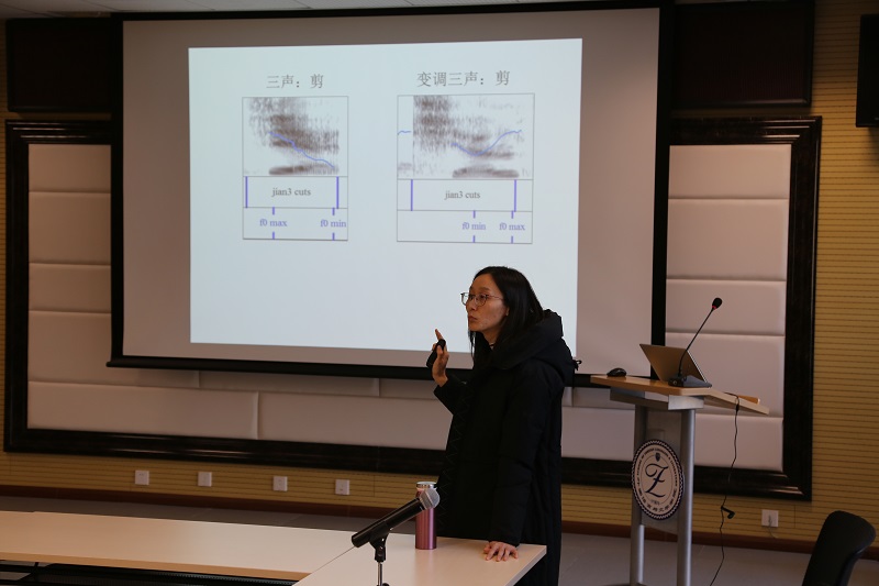 杨安琪毕业于荷兰乌特勒支大学,语言学博士,主要研究领域为儿童语言发展,语音学与音系学。本次沙龙上,杨老师以发表于SSCI期刊《FIRST LANGUAGE》的《汉语儿童对焦点标记的习得 》作为报告题目。她研究了母语为汉语普通话的儿童如何使用韵律在语言中标记新的、重要的信息即“焦点”的问题。杨老师介绍说,实验中他们围绕一套图片游戏,和4到11岁的儿童以及成年被试者展开对话,引出了自然状况下产出的语言。他们的研究发现,儿童在4到5岁即可像成年人一样,通过控制发音的时长来区分焦点和非焦点以及不同种类的焦点;他们使用音高标记焦点的能力受年龄和声调限制,虽然此能力在4到11岁期间有明显的发展迹象,但即便到11岁,儿童仍不能像成年人一样系统地在所有声调上通过调整音高标记焦点。文章认为,母语为汉语的儿童标记焦点的能力受声调的限制,在汉语中音高有控制声调、标记焦点等多重功能。汉语儿童在调整音高标记焦点的同时,还要确保词语本身的声调不受影响,这要求他们精准控制音高,而这一能力不是先天具备的,需要逐步完善。