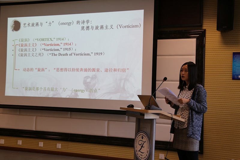 魏琳是中国人民大学比较文学与世界文学博士,美国宾夕法尼亚大学英文系联合培养博士生,她主要研究领域为比较文学、英美文学、西方文论、海外汉学,在《国外文学》、《外语研究》、《中国文学研究》等期刊发表论文多篇。本次沙龙上,魏老师以《华夏旋涡:伊兹拉·庞德旋涡主义思想中的中国内容》作为报告主题。她的论文以庞德的旋涡主义思想为中心,从文史两层面分析由包括语言、文学、绘画在内的中国文化内容(华夏旋涡)为他带来的深刻影响。魏老师介绍说,20世纪初,庞德从意象主义至旋涡主义的思想发展伴随着如下几方面因素:他同英国旋涡派视觉艺术家们的交往以及为之作出的理论贡献;他对以《作为诗歌媒介的中国书写文字》为核心的费诺罗萨手稿的阅读和编辑以及同时期对中国古诗的诗意译写;他以比尼昂著《龙的翱翔》和伦敦大英博物馆为媒介、对中国诗画语言的感知。魏老师认为,从庞德旋涡主义诗学思想的形成和诗歌译写中的风格变化来看,华夏旋涡为他的思想发展和文学创作带来了持续一生的深远影响。