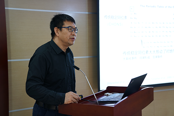 陈玖斌教授作《非传统同位素—地球环境科学研究的新地标》的报告。他详细介绍了非稳定同位素在追踪地表到深层的物质(能量)运动、诊断地球“健康状况”的重要意义,并结合本领域科技工作现状,提出以实验、观测、模型、理论四方面系统研究不同时间、空间上的表层地球系统科学问题,加强学科交叉与合作,促进本研究领域关键科学问题的解决。