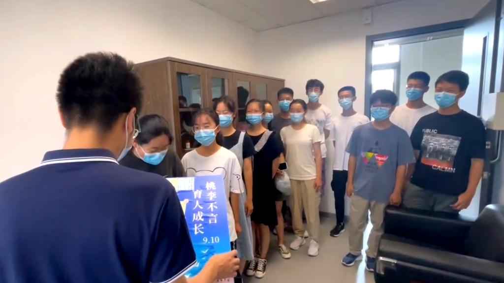 本站讯(记者焦德芳)全班“一起努力”的手工心意满满、一束鲜花还要伴随教室里的歌声齐唱、瓶瓶罐罐的实验室里今天工科生跳起了快闪……9月9日是教师节前最后一个“上课日”,这一天,天大学子纷纷以自己个性的表达,为老师们送上节日的爱与祝福。