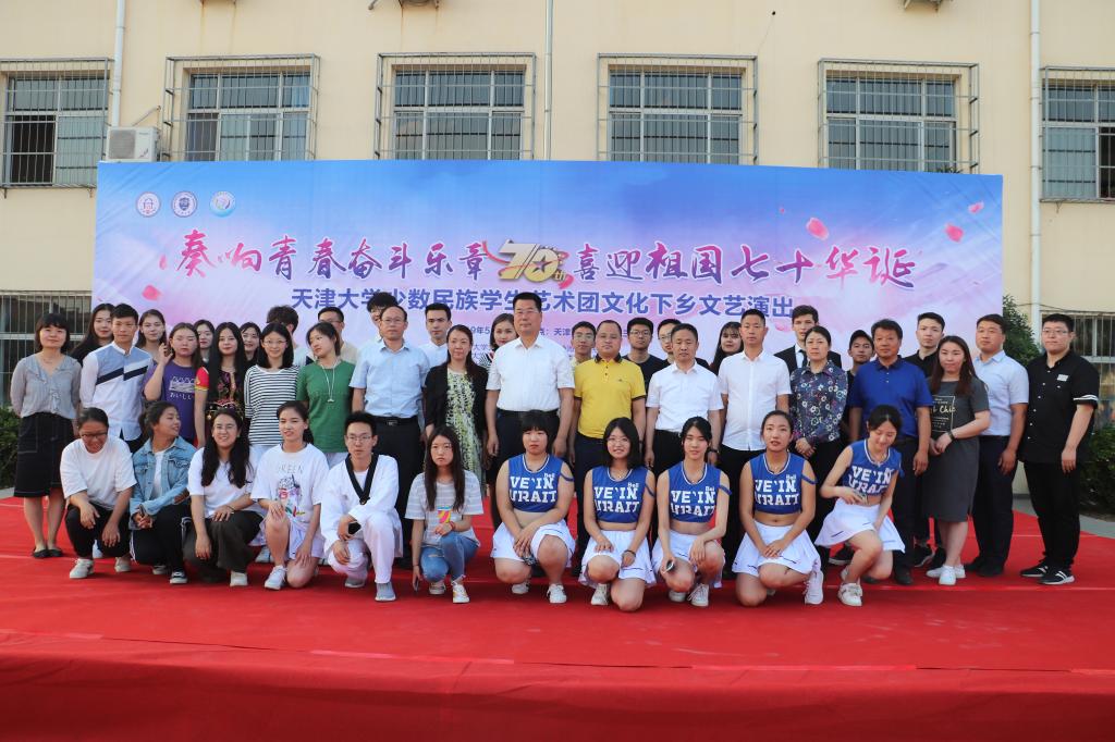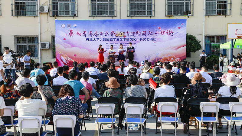 此次活动以学习宣传贯彻党的十九大精神,庆祝新中国成立70周年为主题,通过文化下乡演出丰富群众精神生活,促进文化交融,增进民族团结,助力文化扶贫政策在乡村的落地生根。现场演出分为“青春正当时、奋进新时代、共圆中国梦”三个篇章,来自天津大学少数民族学生艺术团的维吾尔族、蒙古族、藏族等少数民族学生精心准备的舞蹈《歌舞青春》、二胡独奏《赛马》、诗朗诵《讴歌新时代》等精彩节目引来现场掌声喝彩声不断。