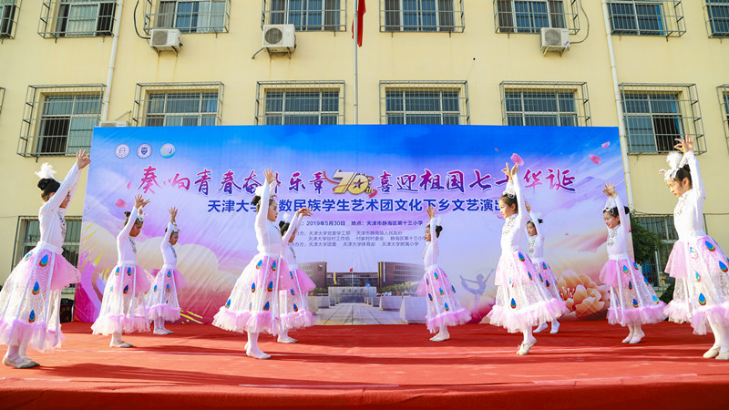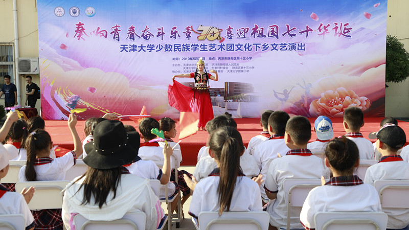 本站讯(通讯员李定杰 帕尔依达)为深入学习贯彻习近平新时代中国特色社会主义思想,庆祝新中国成立70周年,促进各民族交往交流交融,增进民族团结,5月30日,天津大学学工部、团委、体育部、附属小学联合天津市静海镇人民政府、天津大学驻付家村工作组、付家村村委在静海区第十三小学举办“奏响青春奋斗乐章,喜迎祖国七十华诞”主题文艺展演。我校学工部、团委、附属小学及静海区教育局、静海镇党委、学校驻付家村工作组等相关单位领导老师出席活动,学校学生、周边村民等500余人观看了现场文艺演出。