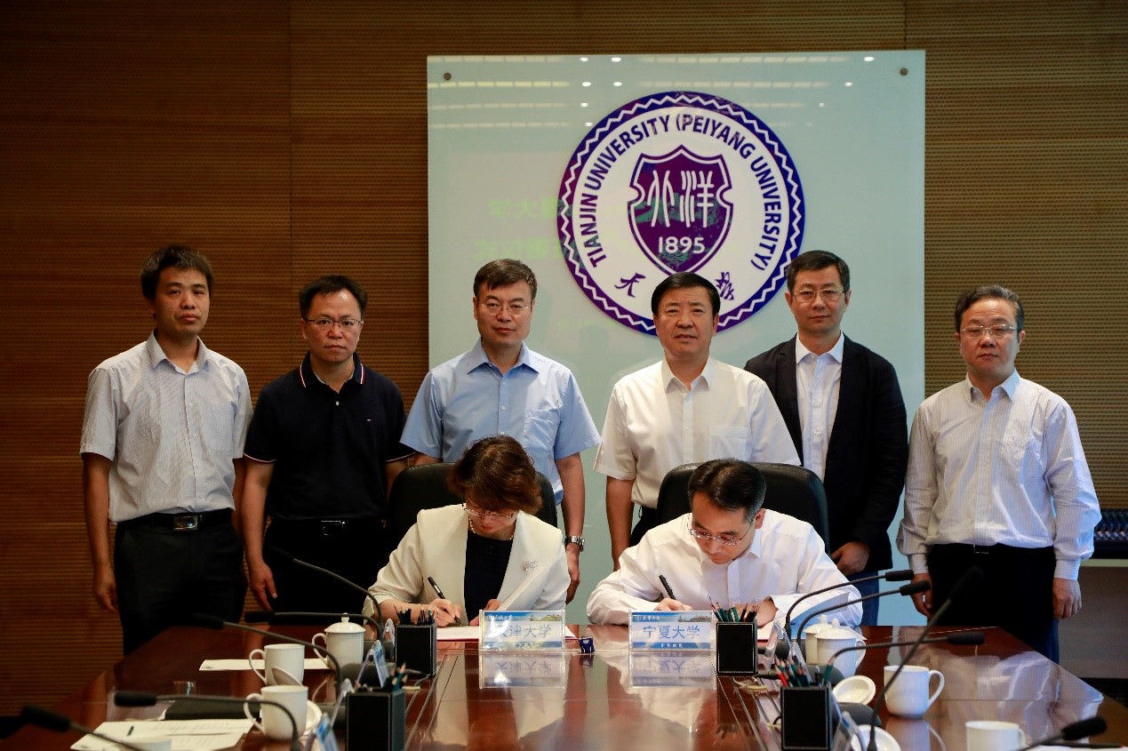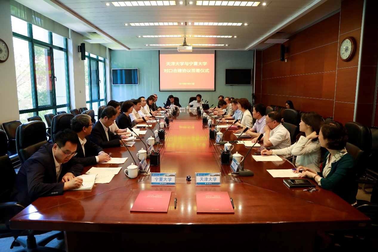 在天津大学校长金东寒、宁夏大学校长何建国和相关专家学者的见证下,天津大学党委副书记雷鸣与宁夏大学副校长史金龙分别代表两校签署协议。签约后,两校召开座谈会,就今后的合作进行深入交流,两校相关学院和部处负责人参加座谈会。